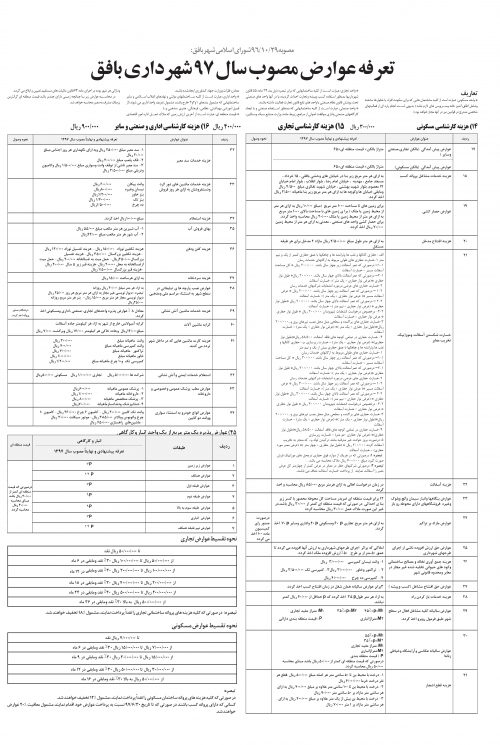 تعرفه عوارض مصوب سال 97 شهرداری بافق