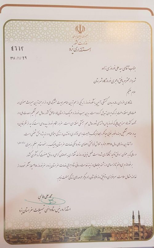 شهردار بافق رتبه اول حوزه گردشگری استان یزد را کسب کرد