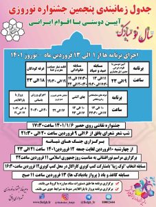 وی برگزاری جنگ های شبانه را تاریخ ۱۰ الی ۱۲ فروردین ماه جاری اعلام کرد و افزود: این برنامه شاد و مفرح با هدف ایجاد روحیه امید و شادابی در مردم، هر شب از ساعت ۲۱ الی ۲۳ با هنرنمایی هنرمندان بومی و کشوری برنامه ریزی شده است.