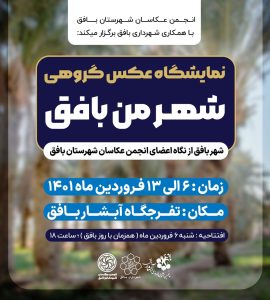 وی افزود: مراسم افتتاحیه این نمایشگاه که با همکاری انجمن عکاسان و شهرداری بافق برگزار می شود همزمان با روز بافق ساعت ۱۸ در گردشگاه آبشار می باشد.