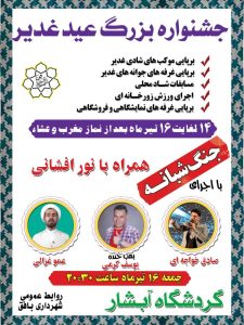 به گزارش روابط عمومی شهرداری بافق؛ سید علی نوروززاده گفت: به مناسبت عید سعید غدیر خم از ۱۴ لغایت ۱۶ تیر ماه، هرشب بعد از نماز مغرب و عشا، جشنواره عید غدیر با برنامه های متنوع در گردشگاه آبشار بافق برگزار می شود.